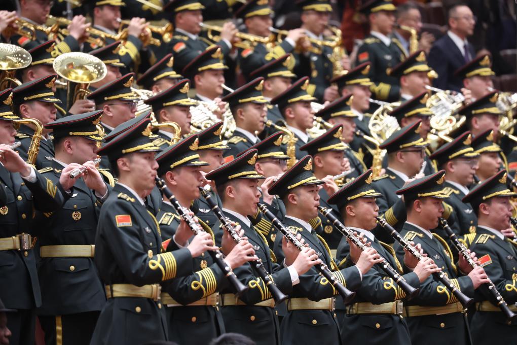 3月4日,全國政協(xié)十四屆三次會議在北京人民大會堂舉行開幕會。這是軍樂團在演奏。