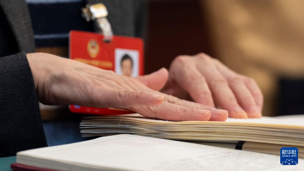 3月5日,在全國政協(xié)十四屆三次會議社會福利和社會保障界別小組會議現(xiàn)場,政協(xié)委員觸摸盲文版政府工作報告。