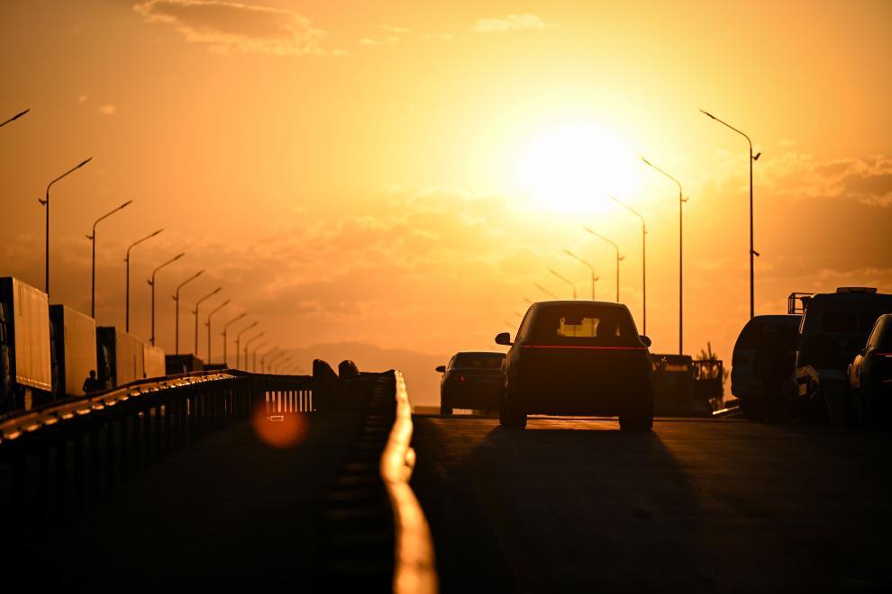 運輸公司工作人員將中國新能源車從霍爾果斯運向哈薩克斯坦一側中轉(zhuǎn)停車場。新華社記者 李任滋 攝