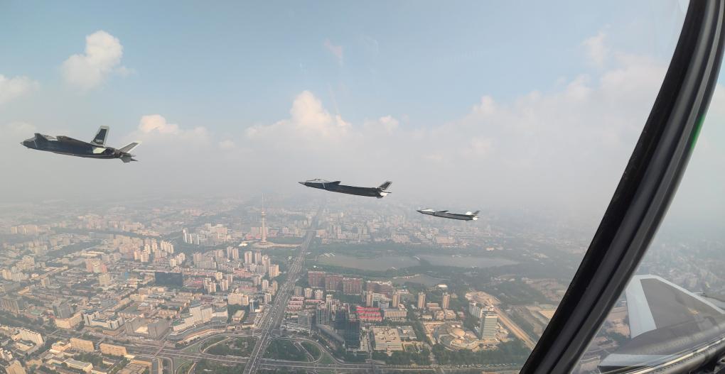 9月3日,紀(jì)念中國(guó)人民抗日戰(zhàn)爭(zhēng)暨世界反法西斯戰(zhàn)爭(zhēng)勝利80周年大會(huì)在北京隆重舉行。這是殲擊機(jī)梯隊(duì)從北京城區(qū)上空飛過。新華社記者 白雪騏 攝