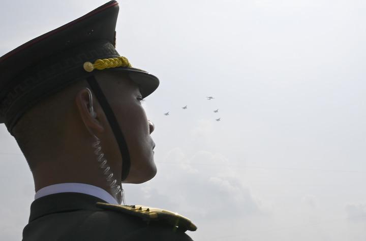這是一支聯(lián)合的力量。空中受閱梯隊(duì)由陸、海、空三個軍種29型飛機(jī)編成。