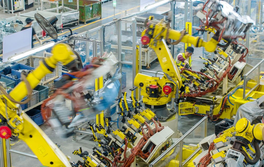浙江省湖州市長(zhǎng)興經(jīng)濟(jì)技術(shù)開(kāi)發(fā)區(qū)的長(zhǎng)興地通汽車(chē)部件有限公司技術(shù)人員操控工業(yè)機(jī)器人生產(chǎn)新能源汽車(chē)配件(無(wú)人機(jī)照片,2025年10月9日攝)。新華社發(fā)(譚云俸 攝)